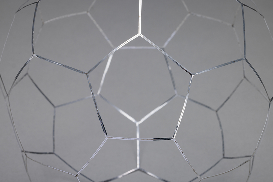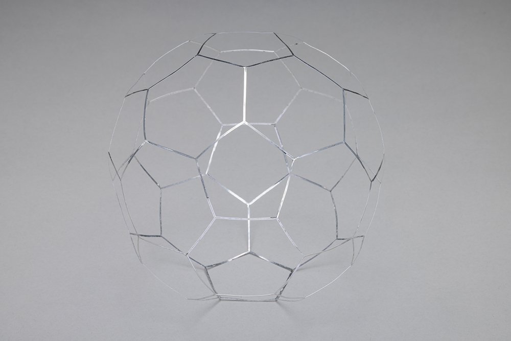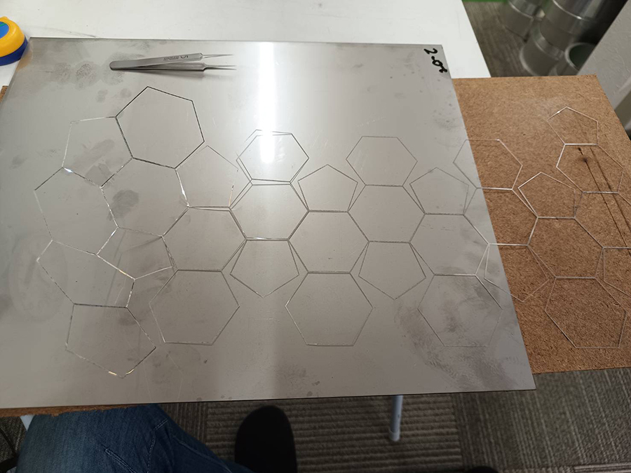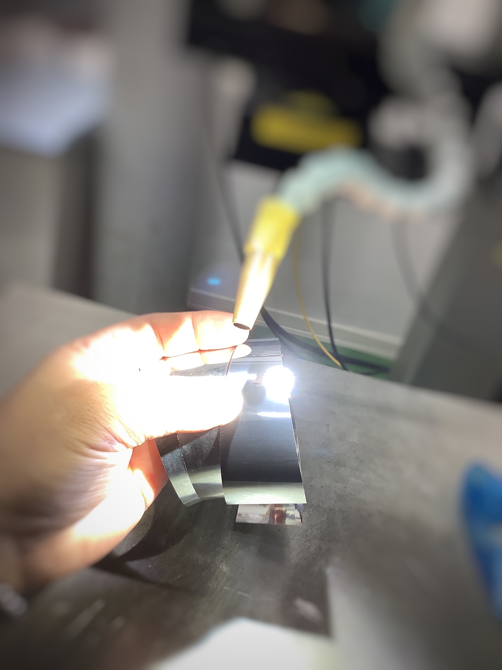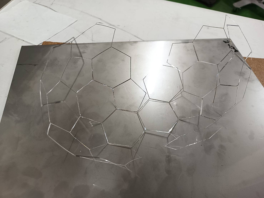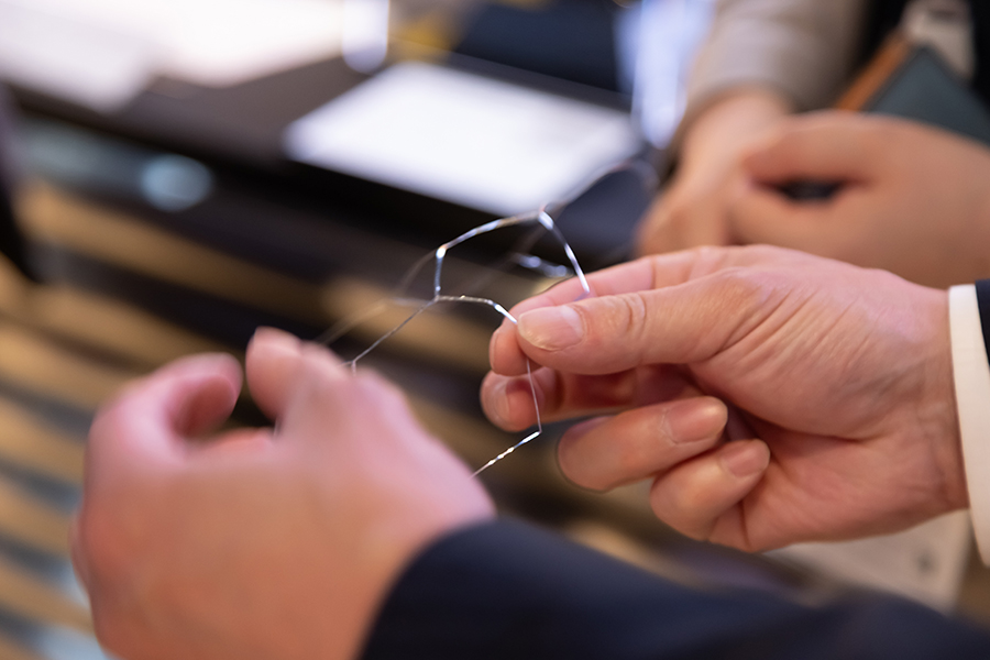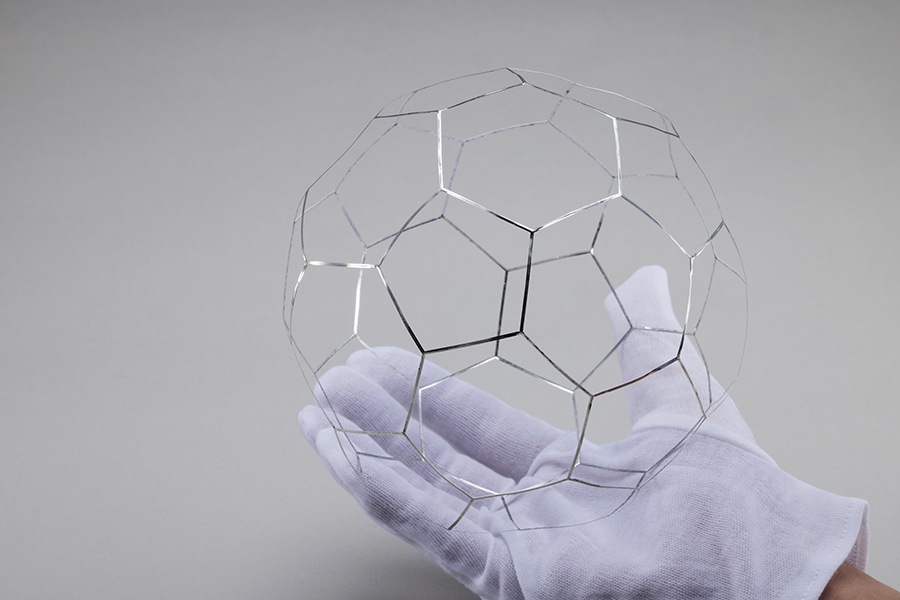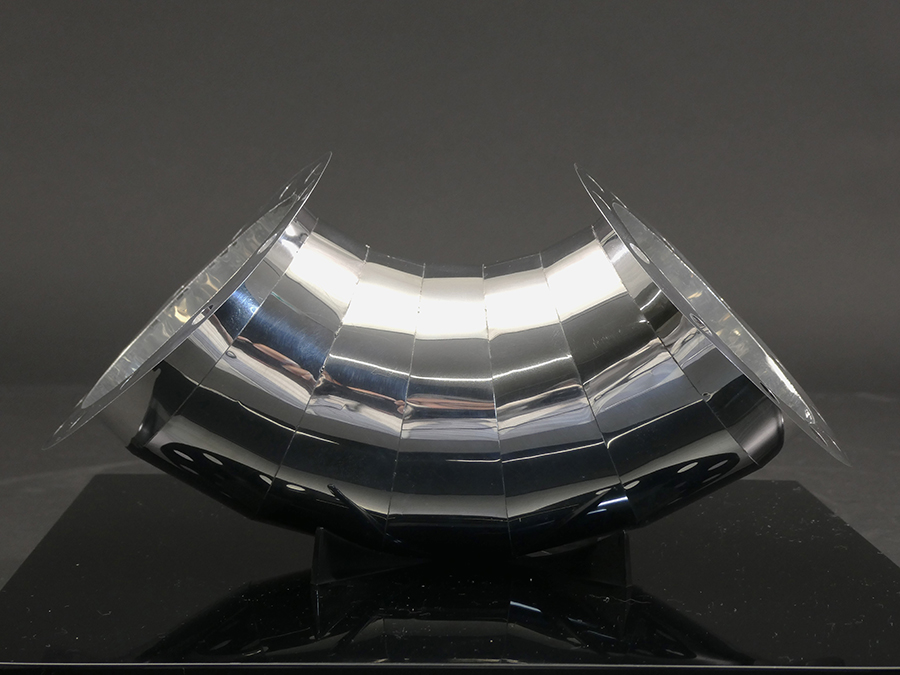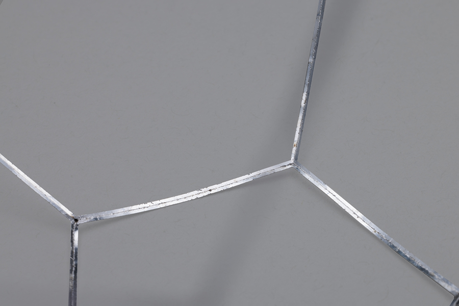 本製品は、アルミ0.1mmという極薄材を使用するため、歪みにくい材料選定から始まりました。切断工程では、溶接時に隙間なく密着するようレーザー出力条件を最適化し、切断面がまっすぐ仕上がるよう調整しています。 面ではなくフレーム形状で合わせが難しく、溶接時に熱だまりや欠落が起こりやすい構造です。極力入熱を抑えつつ幅0.5mmを突き合わせ共付け溶接することでフレーム幅1mmを実現しました。 さらに組立方法にも工夫を加え、右から左へ順に溶接するのではなく、一枚の展開を切り離さず三つのブロックに分けて部分的に先に溶接し、最終的に合わせる方式を採用。これは、分解した部品を組み合わせる方法では、各部品の歪みによるズレで合わせが上手くいかなくなるためです。 完成品はわずか0.75gと1円玉より軽量で、薄く立体的な形状ながら、後仕上げ不要の溶接ビードそのままでも美しい外観を実現しています。