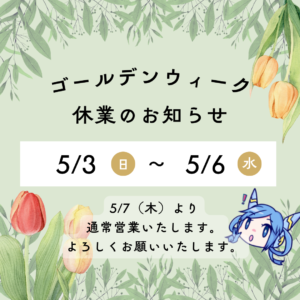 誠に勝手ながら、弊社のGWは、5/3(日)~6(水)となります。